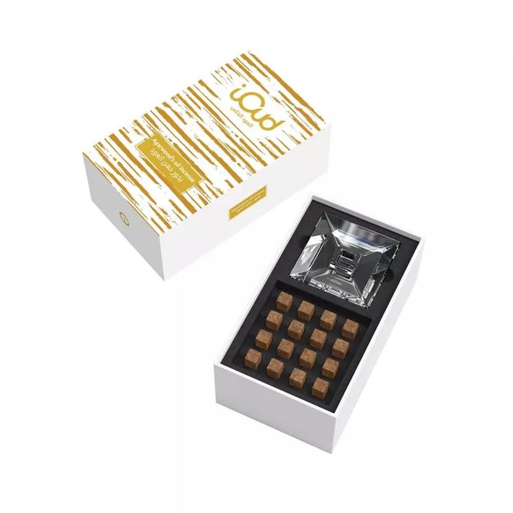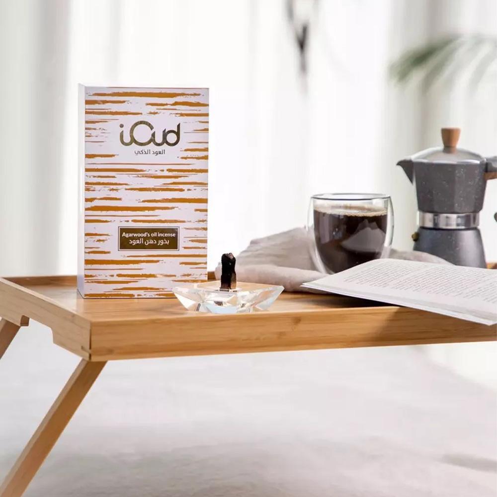 البخور الذكي من اي عود برائحة دهن العود بودرة خشب العود الطبيعي مع خلاصه زيوت أشجار العود، مزيج من خشب العود النقي واحساس دهن العود العميق والثمين ولمسات الورد الدافئة.
