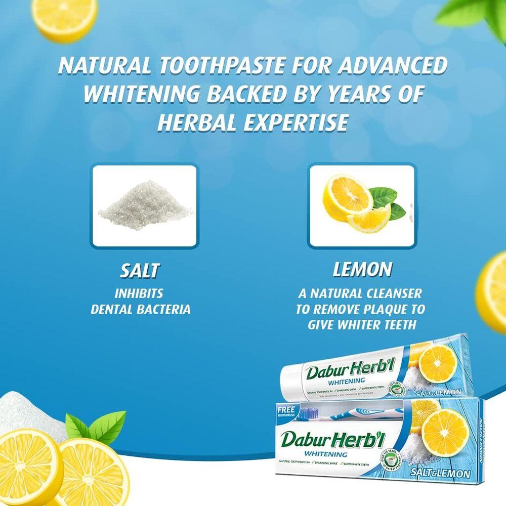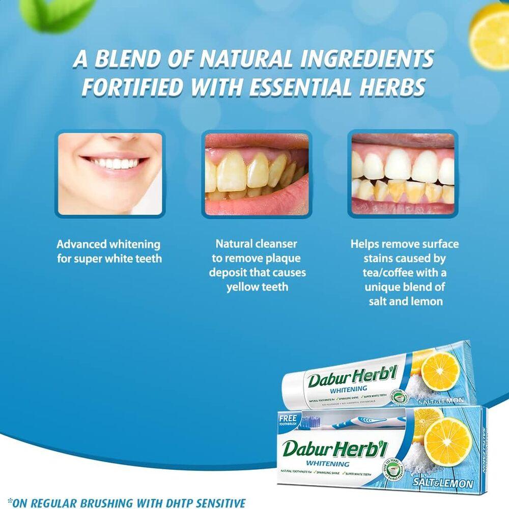 دابر معجون أسنان الأعشاب بالملح والليمون مع فرشاة هو معجون أسنان مبتكر يجمع بين فوائد الأعشاب الطبيعية والملح والليمون لتقديم رعاية شاملة للفم والأسنان. يتميز هذا المعجون بقدرته على تنظيف الأسنان بعمق، ومنع تسوس الأسنان، وتعزيز صحة اللثة، مما يضمن لك ابتسامة مشرقة ونفسًا منعشًا.