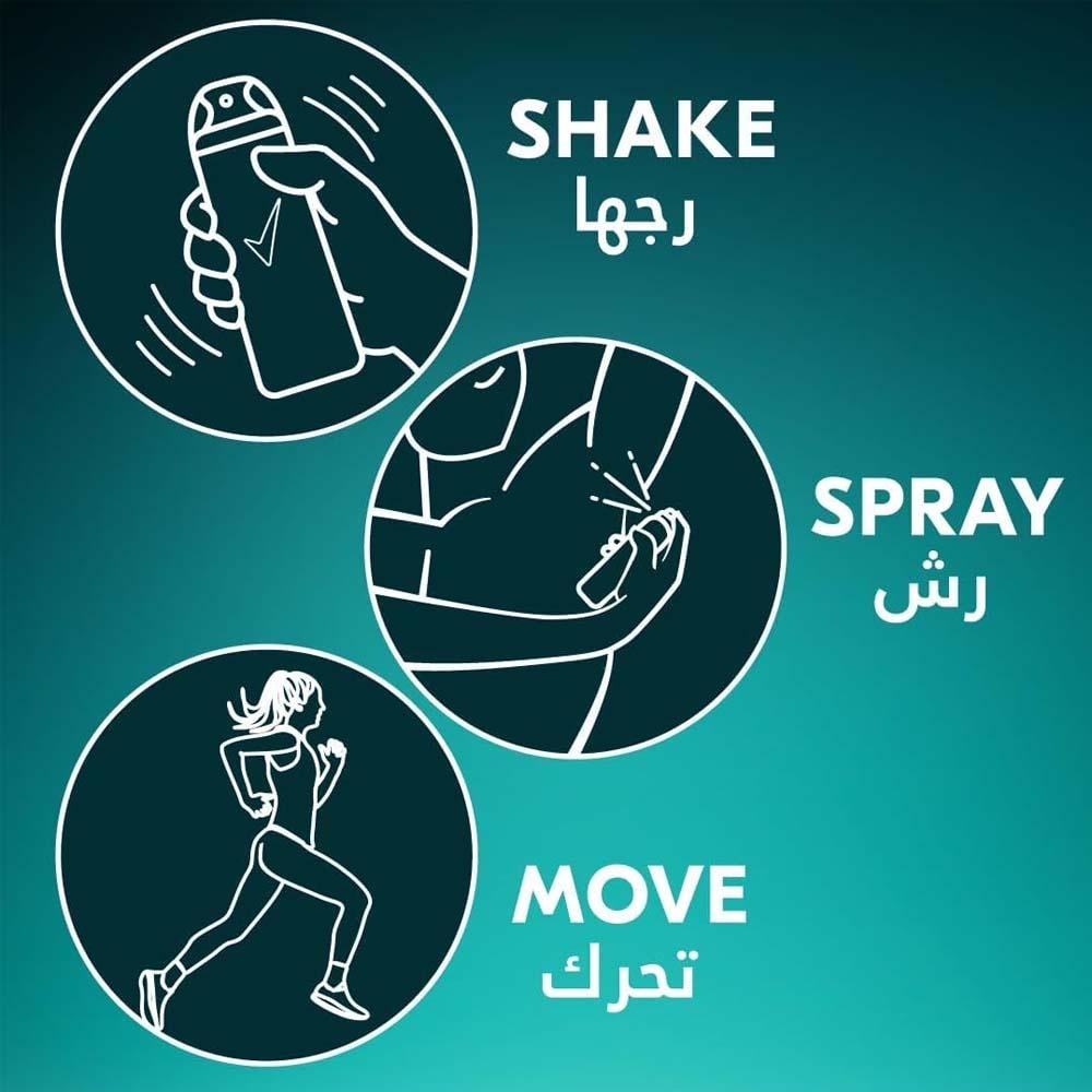 امسكي العبوة على بعد 15 سم من منطقة تحت الإبط ورشي بالتساوي.