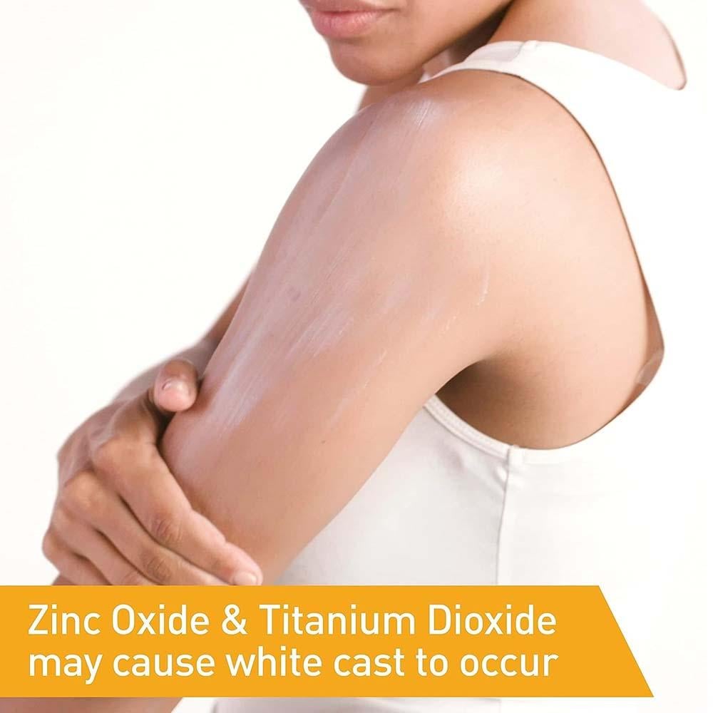 - يوفر حماية من الأشعة فوق البنفسجية الطويلة A المتوسطة B مع ثاني أكسيد التيتانيوم وأكسيد الزنك.