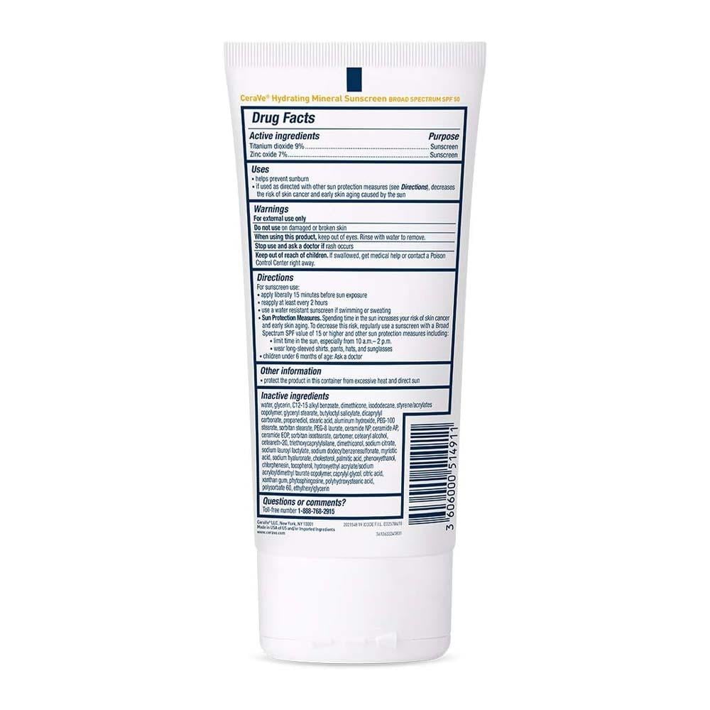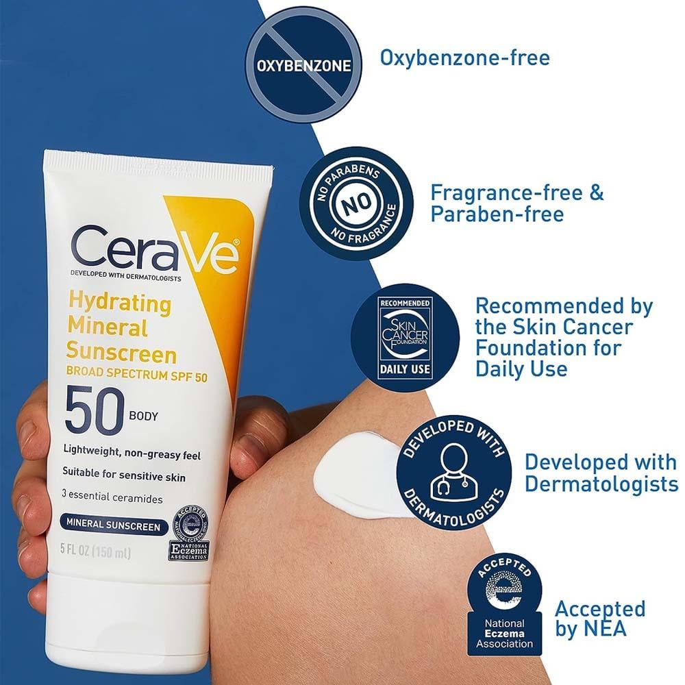 سيرافي كريم واقي شمس معدني بعامل حماية 50 - 150مل يوفر حماية UVA / UVB مع ثاني أكسيد التيتانيوم وأكسيد الزنك، له لون شفاف يمتزج مع جميع ألوان البشرة ولا يترك صبغة بيضاء. واقي الشمس غير دهني ومناسب للبشرة الحساسة.