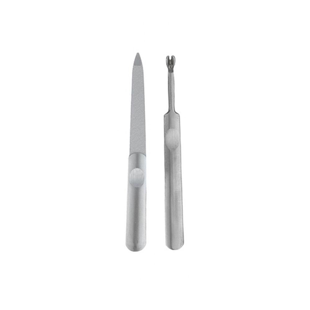 هذا الطقم المميز للعناية بالأظافر يتكون من قطعتين أساسيتين: مبرد أظافر ودافع أظافر، وكلاهما مصنوع من الستانلس ستيل المقاوم للصدأ. يتميز المبرد بسطحه الناعم والدقيق الذي يساعد على تشكيل الأظافر بدقة وسهولة، بينما يساعد دافع الأظافر في إرجاع الجلد المحيط بالأظافر بلطف لخلق مظهر أنيق ونظيف.