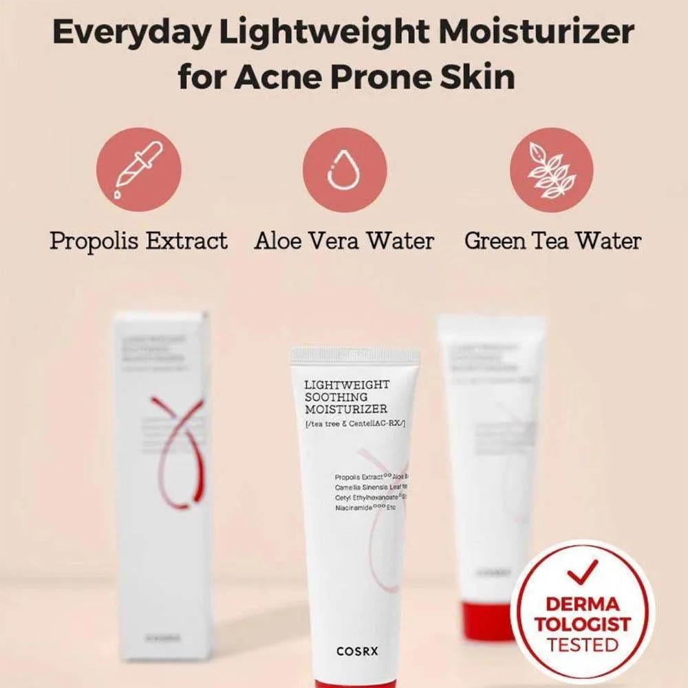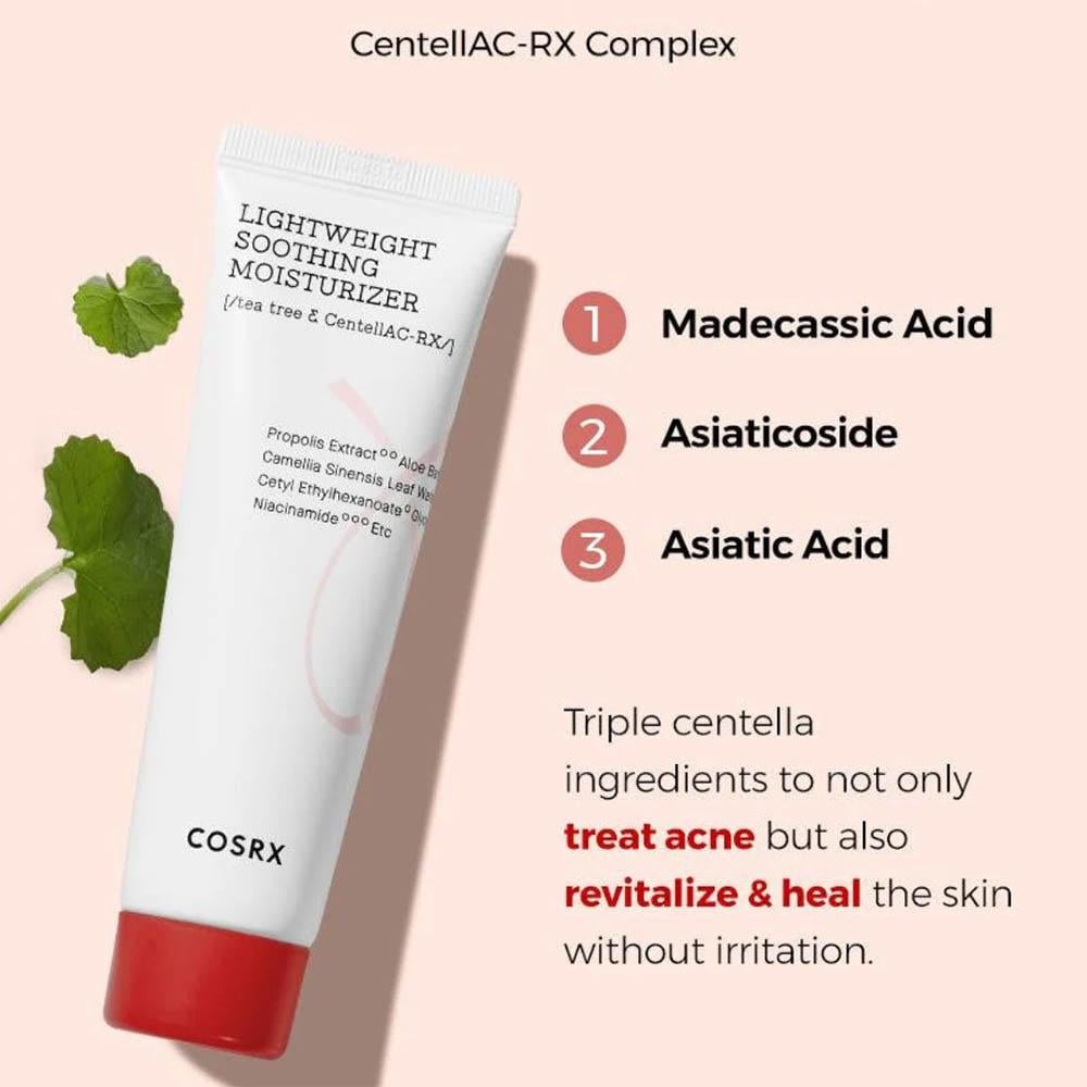 "كوسركس ايه سي كوليكشن مرطب مهدئ خفيف الوزن للبشرة" مبتكر مصمم خصيصًا للبشرة الدهنية والمعرضة لحب الشباب. يتميز بتركيبته الخفيفة والخالية من الزيوت، مما يجعله مناسبًا للاستخدام اليومي دون التسبب في انسداد المسام. يحتوي هذا المرطب على مزيج فريد من المكونات المهدئة والمغذية، بما في ذلك مستخلص بروبوليس النحل، ماء أوراق الألوة فيرا، وماء أوراق الشاي الأخضر. تعمل هذه المكونات معًا على تهدئة البشرة المتهيجة، تقليل الاحمرار، وترطيب البشرة بعمق دون ترك أي شعور دهني. بالإضافة إلى ذلك، يحتوي المرطب على مركب "CentellAC-RX" الحصري من COSRX، والذي يضم ثلاثة مكونات نشطة من نبات "سنتيلا أسياتيكا" (حمض الماديكاسيك، أسياتيكوسيد، وحمض الأسياتيك) المعروفة بخصائصها العلاجية والمهدئة للبشرة.