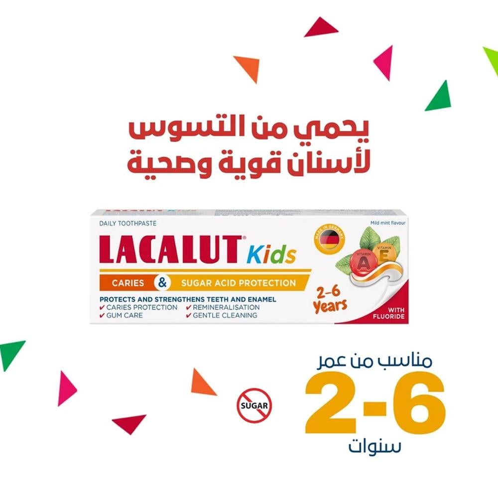 معجون "لاكالوت للأطفال" بنكهة النعناع الخفيفة مصمم خصيصًا للفئة العمرية من 2 إلى 6 سنوات، بتركيبة مدروسة تحتوي على الفلوريد لحماية الأسنان من التسوس وتقوية المينا.