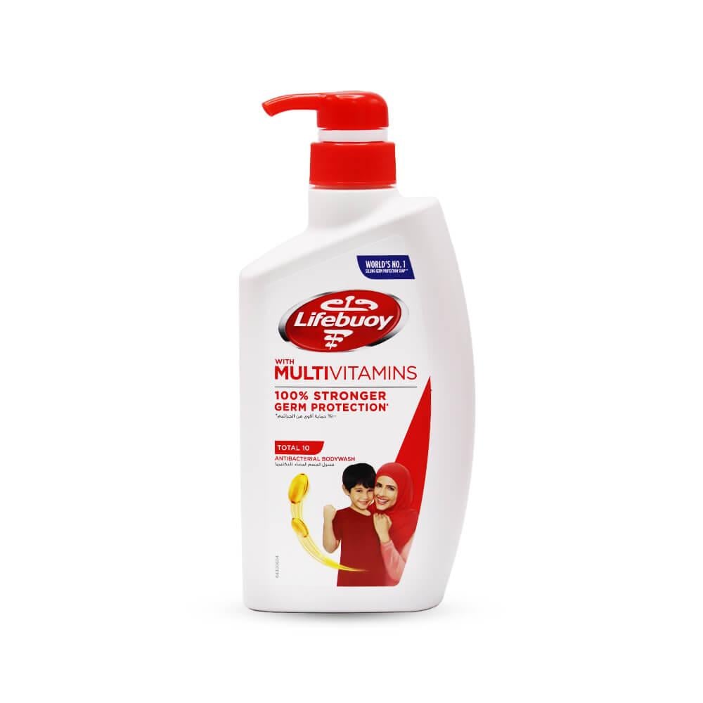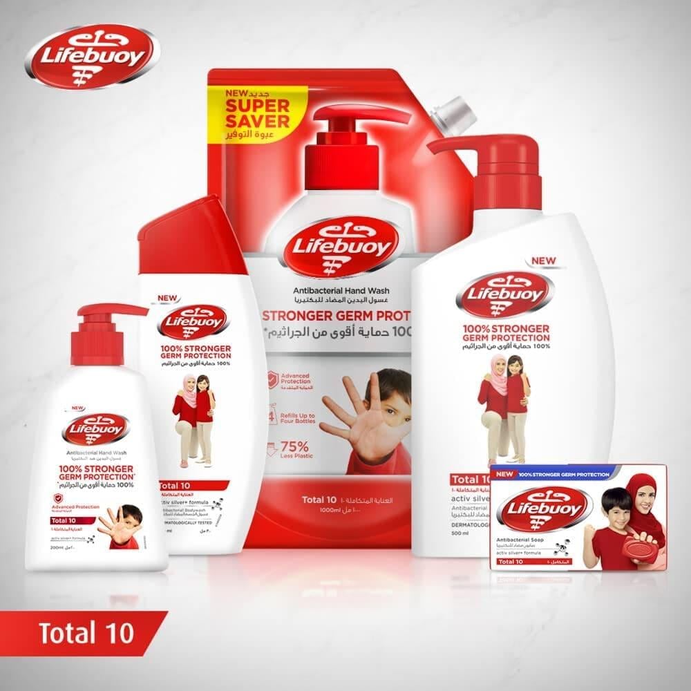 ضعي كمية مناسبة من لايفبوي غسول جسم العناية المتكاملة توتال 10 على يديك أو على لوفة ناعمة.