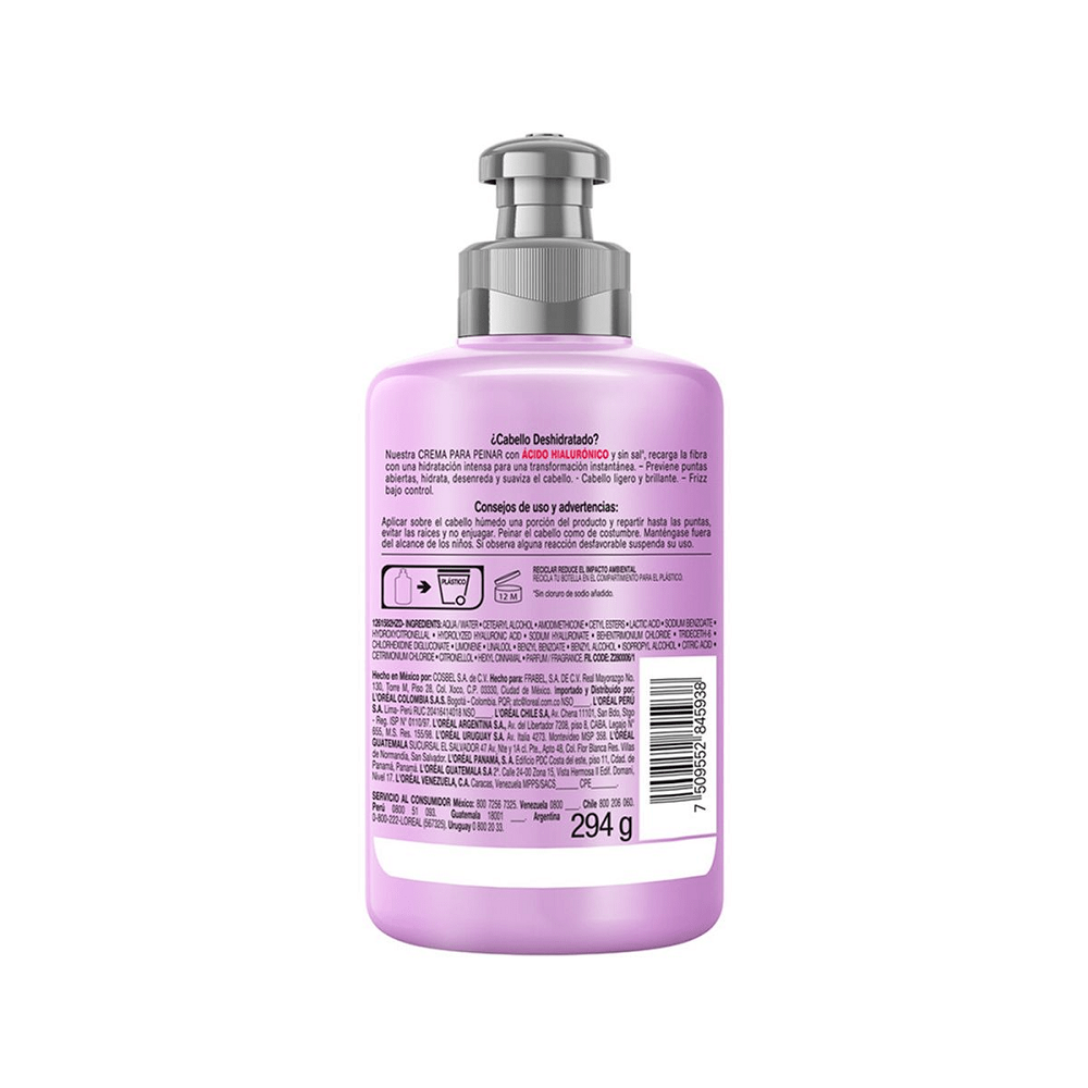 كريم التصفيف من لوريال باريس الفيف مع حمض الهيالورونيك وبدون ملح ، يعيد شحن الألياف بترطيب مكثف لتحول فوري. كريم التصفيف من لوريال باريس الفيف يمنع تقصف الشعر ويعمل على ترطيبه ويفك تشابكه وينعمه. كريم التصفيف من لوريال باريس الفيف مع حمض الهيالورونيك لشعر خفيف ولامع و تجعد تحت السيطرة.هذا الشامبو من لوريال باريس مع حمض الهيالورونيك يرطب الشعر بشكل مكثف لمدة تصل إلى 72 ساعة ، وهو مثالي لجميع أنواع الشعر ، وخاصة الشعر المجفف. تعمل تركيبته ذات التأثير المضاد للملح على إعادة شحن ألياف الشعر لتحول فوري ، مما يترك الشعر ناعماً وخفيفاً للغاية وحركة دون إثقاله. احصلي على جرعة من الترطيب واجعلي شعرك ينتعش.الفوائد والممزيات:كريم التصفيف من لوريال باريس الفيف يمنع تقصف الشعر ويعمل على ترطيبه وفك تشابكه.يساعد في ترطيب خصلات الشعر. فهو يساعد شعرك على الاحتفاظ بالرطوبة لأطول فترة ممكنة، مما يقلل التجعد.يساهم في حصول بصيلات الشعر على التغذية اللازمة.الترطيب الذي يمنحه حمض الهيالورونيك، سيحمي الشعر من الضرر والتكسر. ويساعد على سهولة تمشيط الشعر.مثالي لجميع أنواع الشعر وخاصة الشعر المجفف.طريقة الاستعمال:ضعي جزءاً من المنتج على الشعر الرطب ووزعيه على الأطراف ، وتجنبي الجذور ولا تشطفيه. مشطي الشعر كالمعتاد.التحذيرات:للاستخدام الخارجي فقط.يحفظ في درجة حرارة لا تزيد عن 30.يحفظ بعيداً عن متناول الأطفال.احذر من ملامسة المنتج للعينين. في حال ملامسة العين يشطف بالماء على الفور.