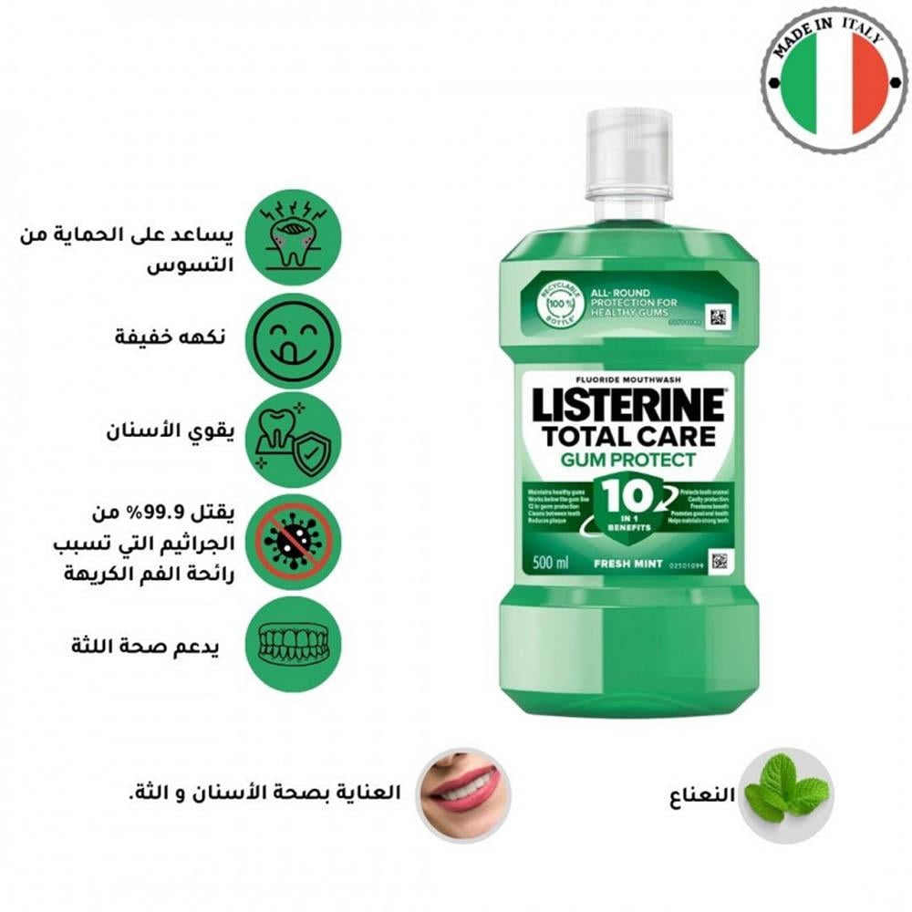 ليسترين العناية الكاملة للّثة - فريش منت غسول فم مصمم خصيصًا لتحسين صحة اللثة ومنحك حماية متكاملة للفم والأسنان. يحتوي على مزيج قوي من الزيوت العطرية المطهرة، بالإضافة إلى الفلورايد، مما يساعد في تقليل التهاب اللثة، منع تراكم البلاك، وتقوية مينا الأسنان. بفضل تركيبته المنعشة بنكهة النعناع الفريدة، يمنحك نفسًا منعشًا طويل الأمد ويكافح رائحة الفم الكريهة.
