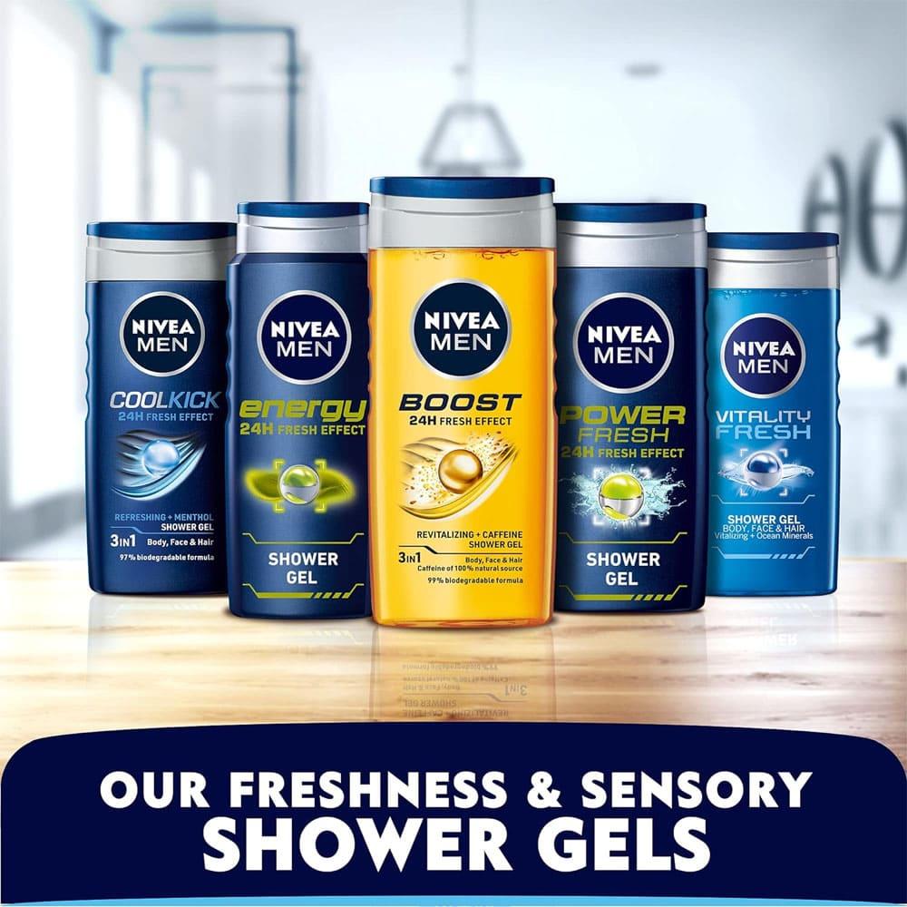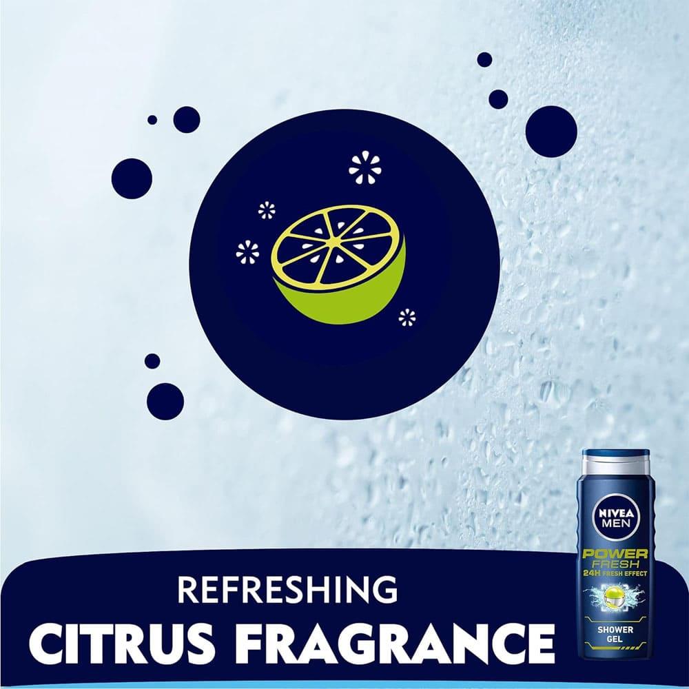 نيفيا جل استحمام باور 24 ساعة فريش افكت للرجال هو جل استحمام رجالي غني بحبيبات التقشير الدقيقة، والتي تعمل على إزالة الشوائب وخلايا الجلد الميتة للحصول على بشرة ناعمة ونضرة. كما أنه يحتوي على فيتامين E، والذي يعمل على ترطيب البشرة والحفاظ على نضارتها.