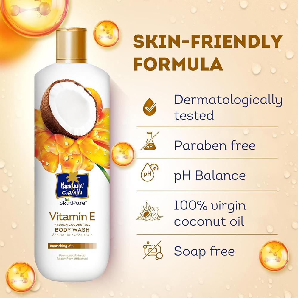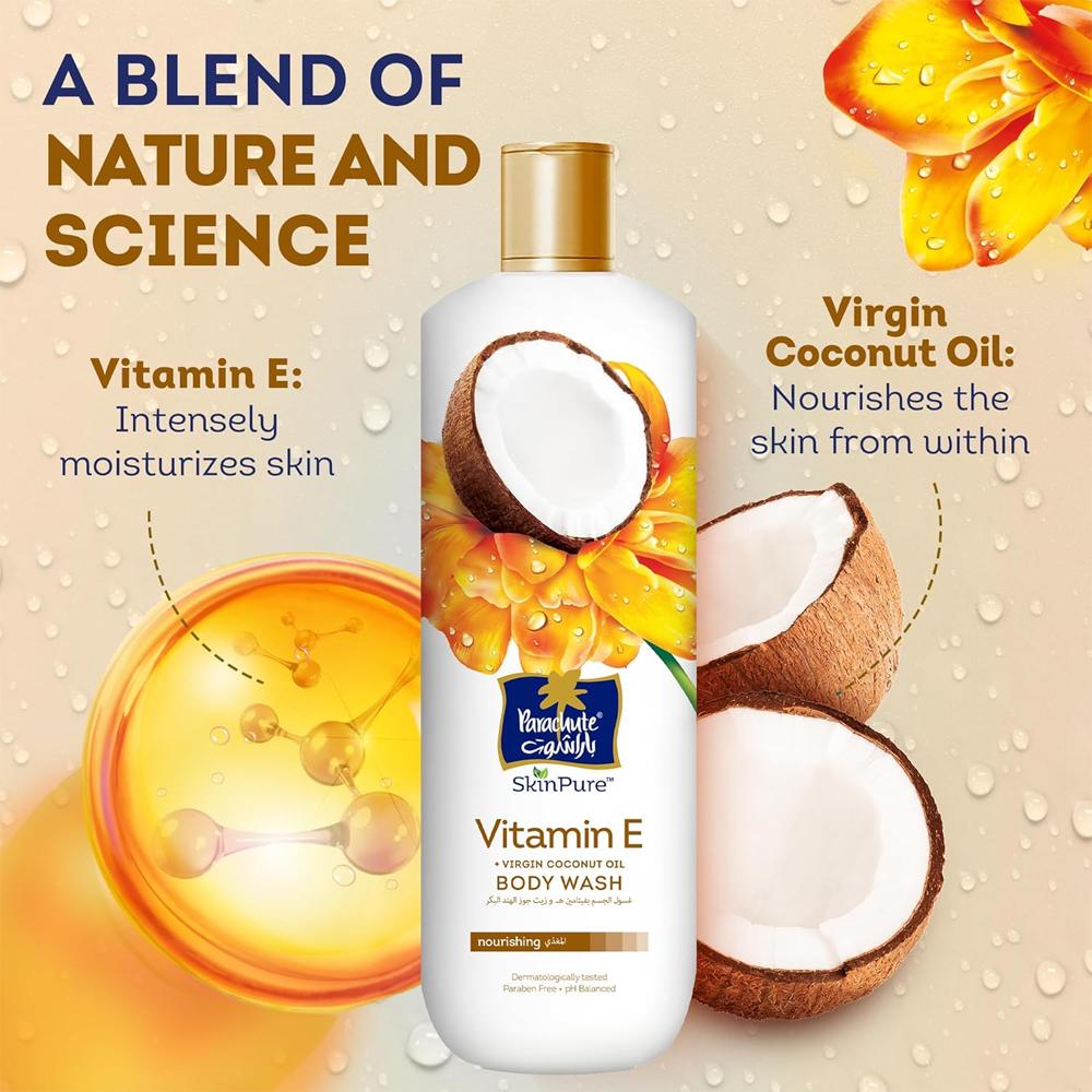غسول باراشوت مزوّد بفيتامين إي وجوز الهند البكر ليغذي البشرة وينظفها بلطف دون تجفيفها.