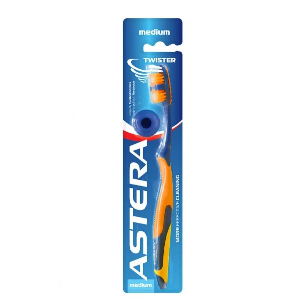 Astera Twister Medium Soft Bristles Toothbrush is a toothbrush manufactured in Saudi Arabia by Astera Personal Care Products Company. The brush features medium soft bristles, making it suitable for people with sensitive teeth or delicate gums. The bristles are also uniquely twisted, providing more effective cleaning of the outer and inner surfaces of the teeth.
