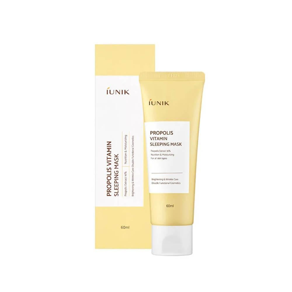 iUNIK Vitamin Propolis Sleeping Mask A hydrating and nourishing mask that works while you sleep to improve skin health. This mask contains 16% Propolis Extract, known for its antibacterial and nourishing properties, 8% Sea Buckthorn Fruit Extract (Hippophae Rhamnoides), rich in vitamins C and E, and 5% Centella Asiatica Leaf Water, which soothes the skin and reduces inflammation. The mask features a creamy texture that provides deep hydration and nourishment to the skin, helping to improve its elasticity and radiance.