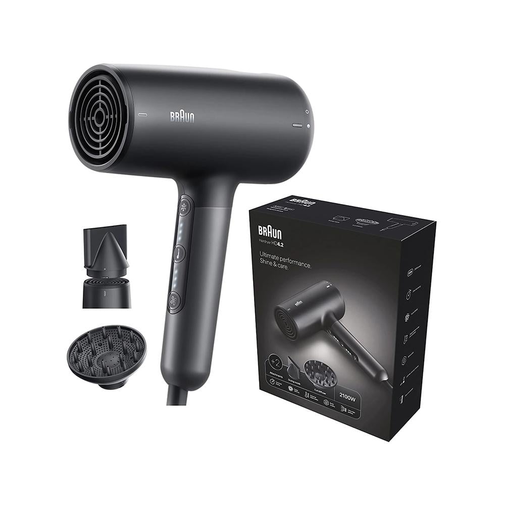The Braun HD4.2 hair dryer delivers professional performance and gentle care, featuring advanced ionic technology that reduces frizz and enhances natural shine. Its elegant black design includes a diffuser for defined curls and a concentrator nozzle for precise styling.
