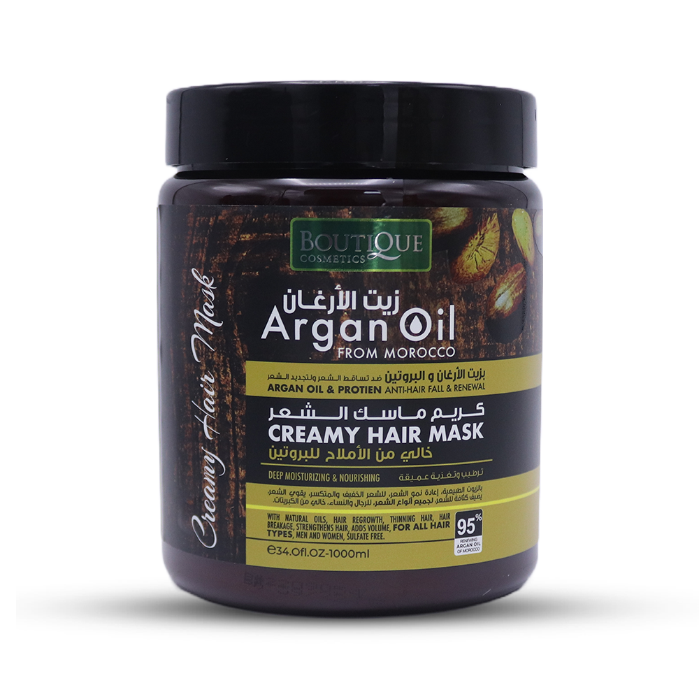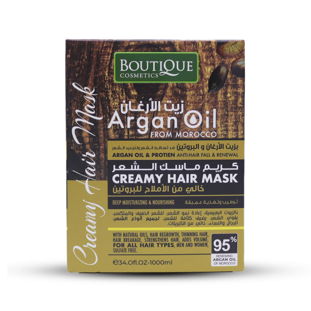 بوتيك كريم ماسك الشعر بزيت الأرغان والبروتين ضد تساقط الشعر ولتجديد الشعر بالزيوت الطبيعية للشعر الخفيف والمتكسر، يقوي الشعر، يضيف كثافة لجميع أنواع الشعر للرجال والنساء خالي من الكبريتات، خالي من الملح، مرطب ومغذي. هذا الماسك الفعال لا يجعل الشعر يبدو أكثر صحة على الفور ويسهل التحكم فيه فحسب، بل تساعد أيضا على حماية وتقوية كل خصلة من الشعر حيث يهدئ ويغذي فروة الرأس لمنع تساقط الأطراف ويصلح مظهر الشعر. تصفيف مناسب للاستخدام اليومي.الفوائد والمميزات:يعمل زيت الارغان على تنعيم الشعر المجعد ويمنحه الحيوية واللمعان.يعالج مشكلة تساقط الشعر وتقصّفه.يساعد في تكثيف الشعر وتعزيز نموه.يساعد في تقوية الشعر الضعيف والهش، نظراً لاحتوائه على الكثير من مضادات الأكسدة الطبيعية. يحسّن زيت الارجان صحة فروة الرأس.يفيد الشعر المصبوغ ويمنع بهتان لونه. طريقة الاستعمال: دلكيه على الشعر المبلل من الجذور حتى نهاية الأطراف ويمشط برفق، يترك لمدة 2-3 دقائق على الشعر ثم يشطف جيدا بالماء.المكونات: ماء نقي ، سيترامونيوم كلوريد . فلوريد بهينتريمونيوم ، زيت أرغان . سيكلو بينتا سيلوكسان ، عطر، ثنائي امين الإيثيلين رباعي حمض الأسيتيك، حمض الستريك ، بيج ٩٠م . الغواران بروتين الحرير, ميثيل أيزوتيازولينون، ايثيل كلورو ايزوتيازولينون.التحذيرات:تحذيرات بالنسبة لبعض الأفراد ، قد يتسبب هذا المنتج في تهيج الجلد ومشاكل في الجهاز التنفسي وردود فعل تحسسية. إذا لاحظت المرارًا أو حرقا أو حكة في الجلد أثناء الاستخدام، فقد يكون لديك حساسية. لذا لا تستخدم المنتج. احرص على عدم دخول الماسك إلى العين وفي حالة حدوث ذلك اغسل العينين بالماء جيدا واستشر الطبيب إذا لزم الأمر. يحفظ المنتج بعيدًا عن متناول الأطفال. للاستخدام الخارجي فقط.