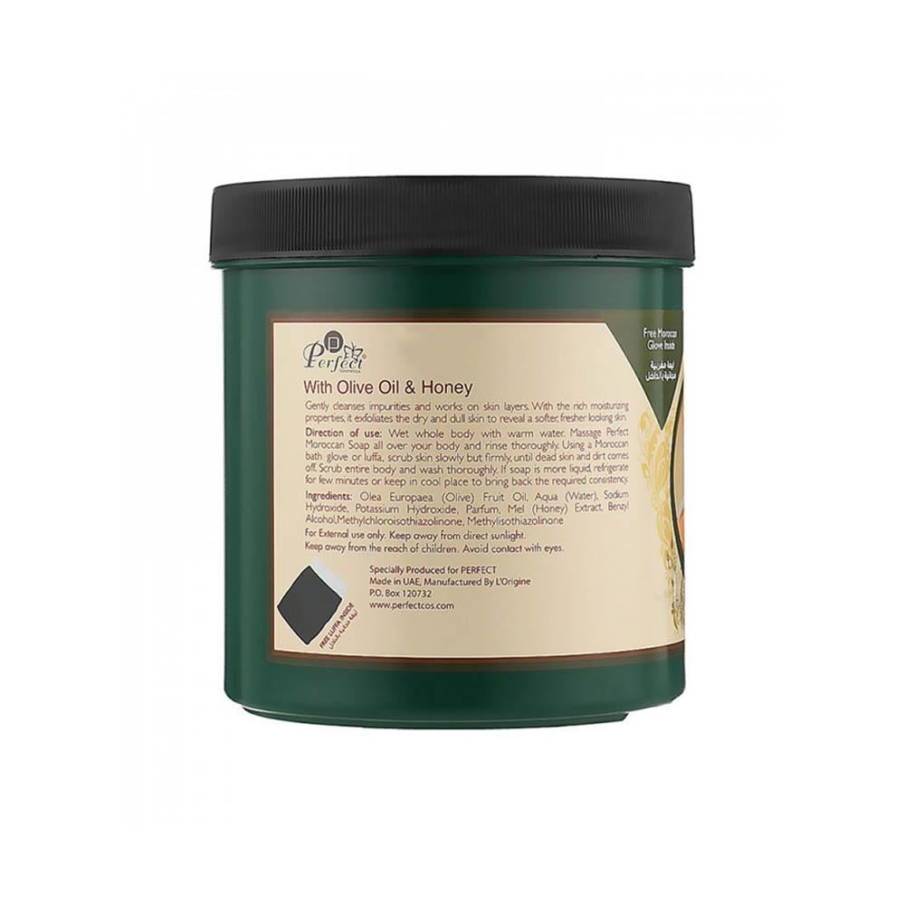 Perfect Moroccan local soap with olive oil and honey extracts gently cleanses impurities and penetrates the layers of the skin thanks to its rich moisturizing properties. Exfoliates dry, dull skin for smoother, more refreshed skin. It contains a free Moroccan loofah inside.