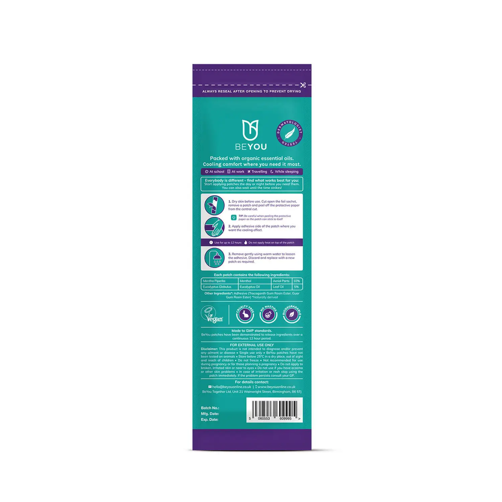 The BeYou Smart Patch helps you relieve period pain and cramping BeYou monthly patches are 100% natural and made with steam-distilled eucalyptus and menthol derived from mint that creates a cooling tingle upon application.