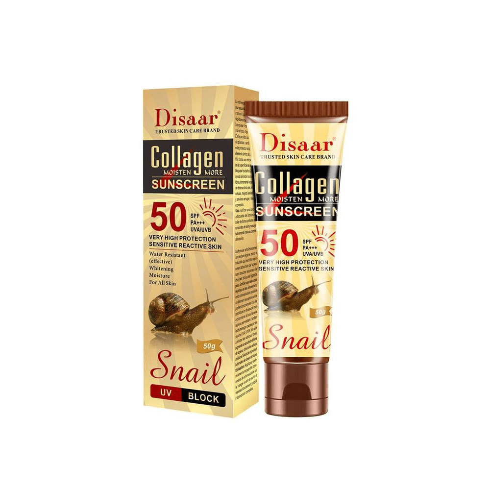 Disaar Snail Sunscreen Cream SPF 50 with Collagen is a light, moisturizing, non-stimulating cream that provides better protection against sunburn and skin aging caused by the sun. This refreshing formula has a light and soft texture, thus it is better absorbed, without clogging pores, and is suitable for all skin types. Rich in botanical extracts and antioxidants. This wonderful product provides hydration to the skin, favoring cell renewal.