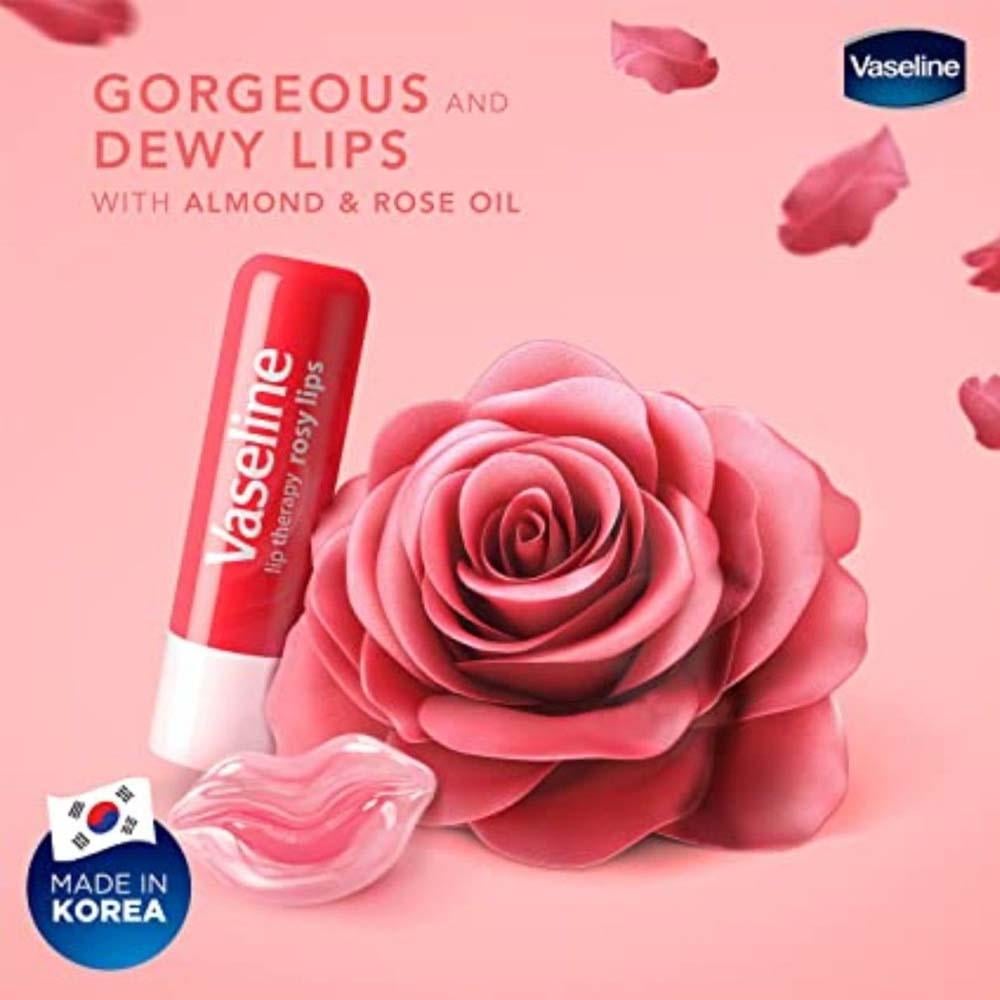 - Vaseline Rosy Rose Lip Balm contains Vitamin E and Sweet Almond Oil, which soothe and moisturize dry, chapped lips.