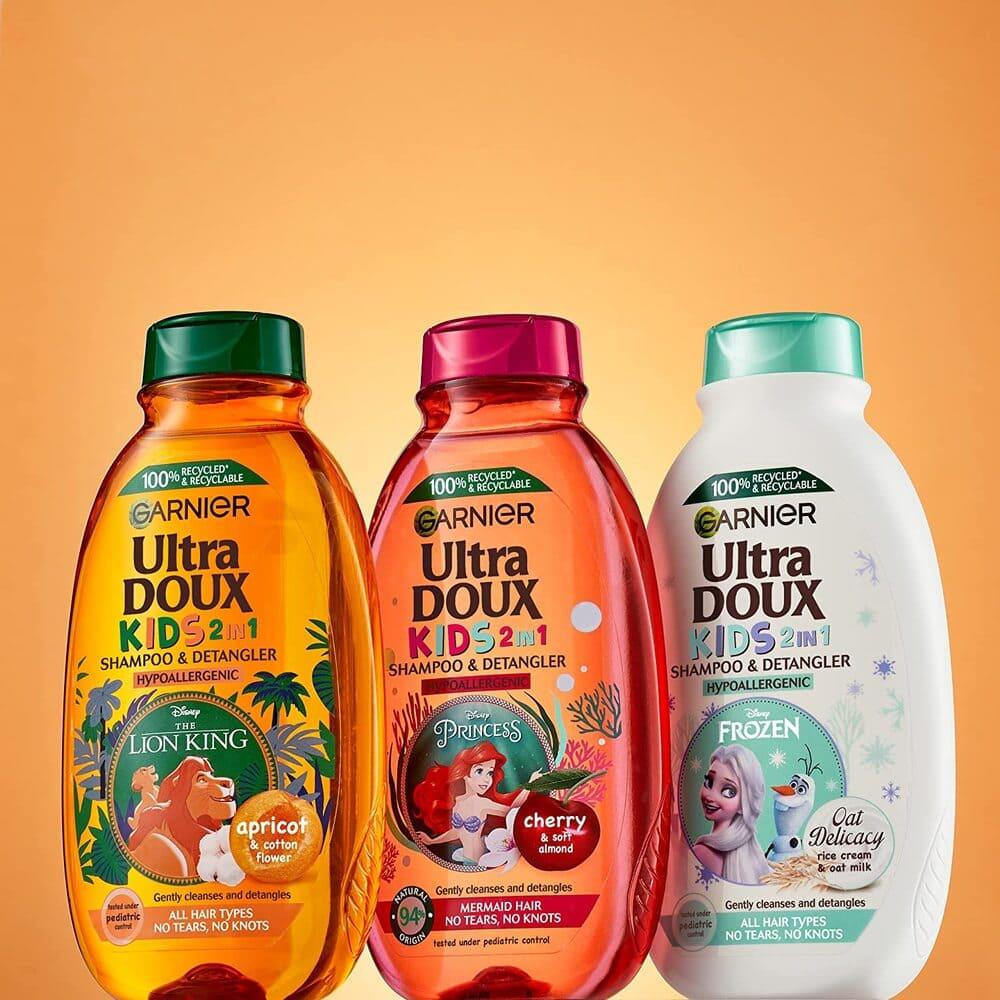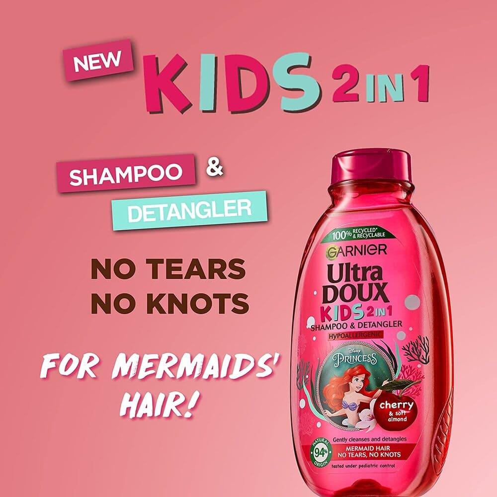 Garnier Ultra Doux Shampoo and Conditioner for Kids 2 in 1 Cherry and Soft Almond For easier styling and fun moments for children while using it, Garnier Ultra Doux shampoo contains Cherry, known for its delicious scent, and Soft Almond, known for its softening qualities. Its gentle anti-tangle and hypoallergenic formula instantly removes knots without irritating the eyes.