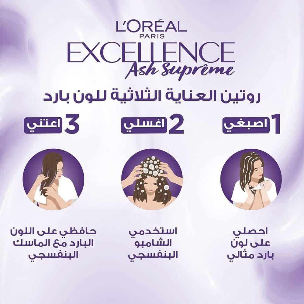 L'Oreal Paris Excellence Ash Supreme Advanced Hair Dye offers cool tones with distinctive gray highlights. This dye combines complete hair care with effective results to cover 100% gray hair, with Triple Protection Technology that nourishes and protects hair before, during and after coloring. It improves hair health and appearance thanks to its nourishing ingredients, making it softer and shinier.