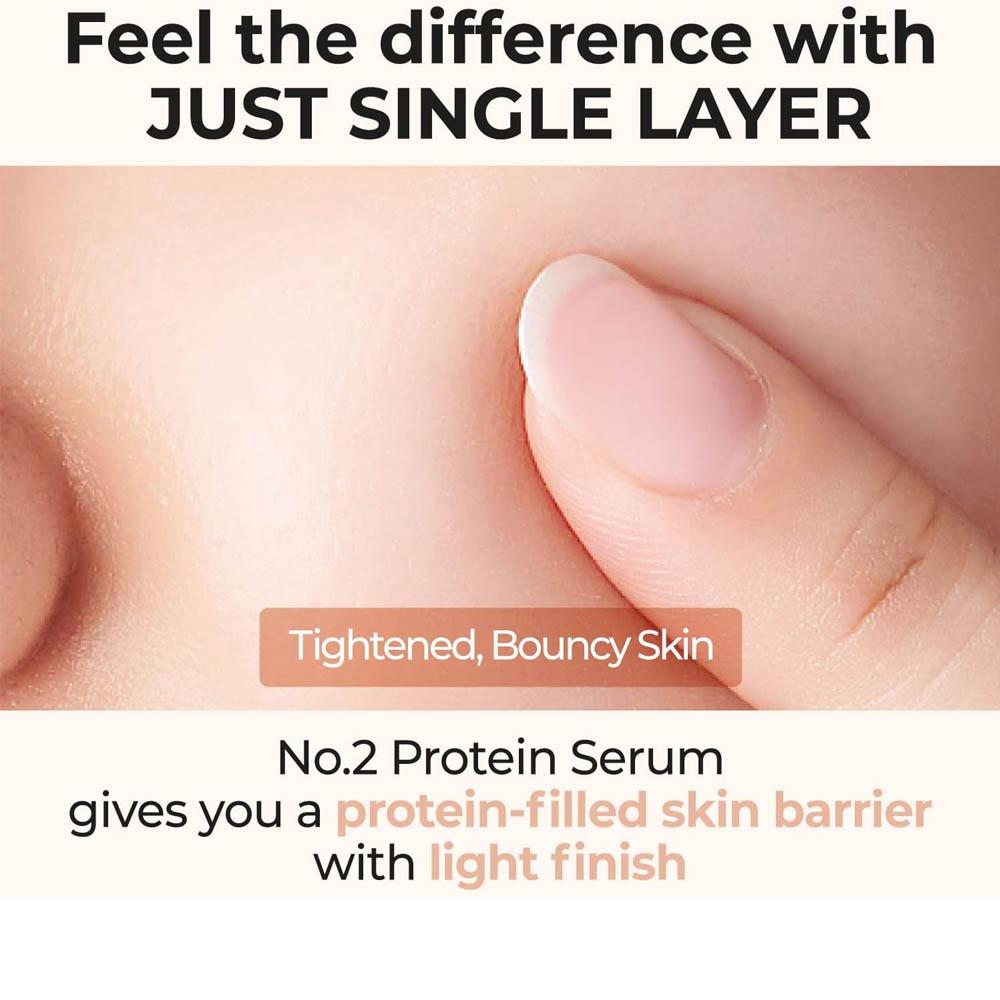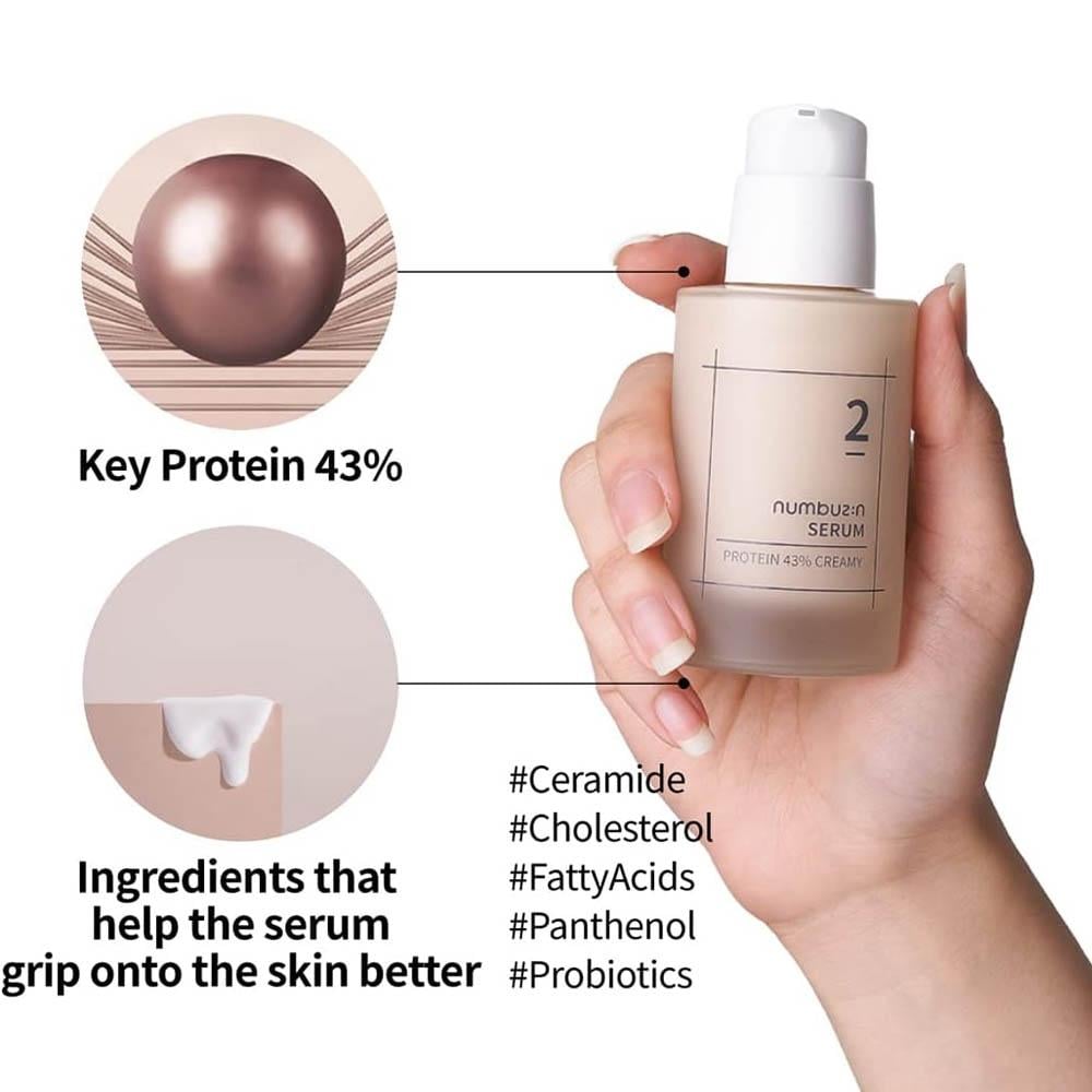 Numbuzin Serum No. 2 "43% Protein Cream" is an innovative serum designed to enhance skin health and strengthen its natural barrier. This serum contains 43% proteins extracted from natural sources such as oats, rice, milk, soy, and sweet almonds, which provide deep nourishment to the skin and help enhance its elasticity.