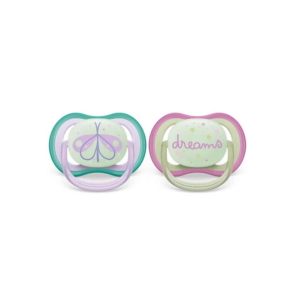 The Philips Avent Ultra Air Soother Nighttime Soother offers a complete solution for soothing and comforting babies from 0 to 6 months. This pacifier is crafted from soft, high-quality, BPA-free silicone, ensuring safety and comfort for your baby's delicate skin. It also features a subtle glow-in-the-dark feature, allowing parents to easily locate it without the need for bright lights, maintaining a calming atmosphere while your baby sleeps. The innovative design also helps circulate air around the mouth to reduce friction and irritation, contributing to a sense of reassurance and relaxation for your baby.