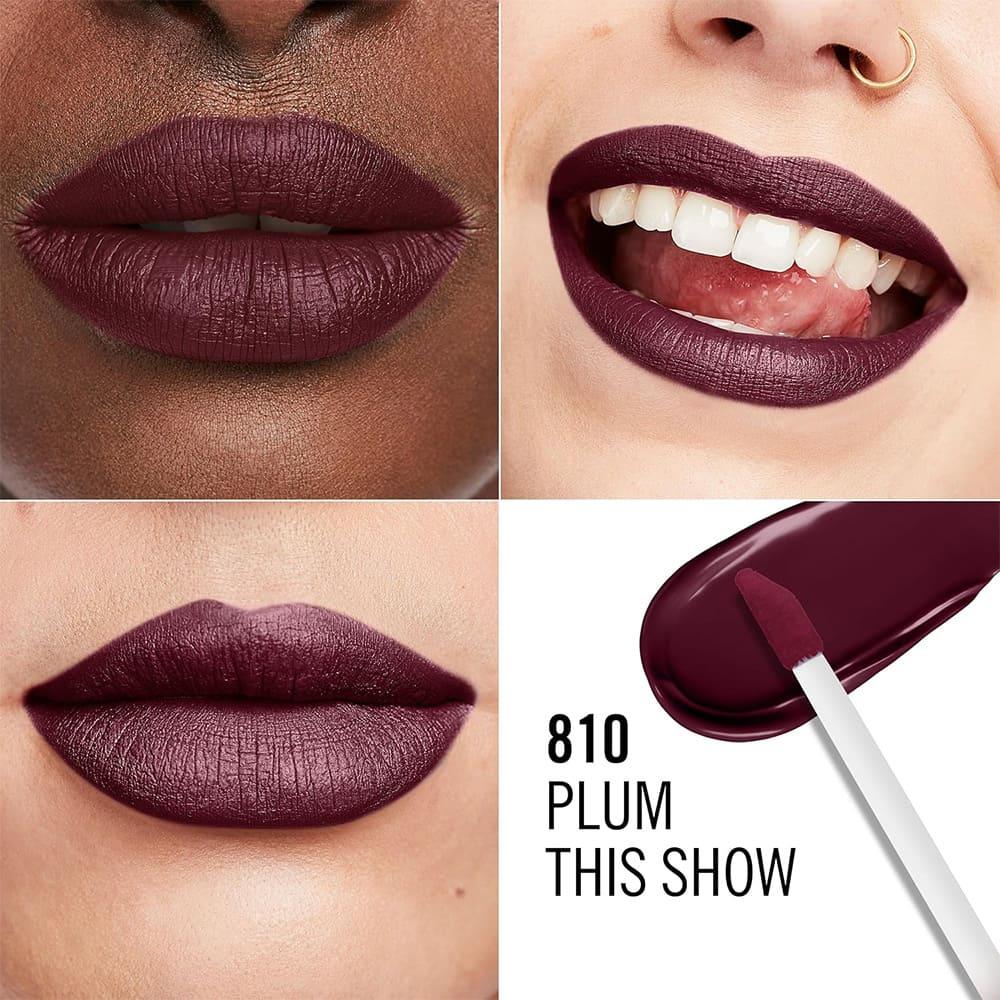 Rimmel London Lasting Mega Matte Liquid Lipstick in the shade No. 810 Plum This Show is a deep, rich plum color. It offers a bold and dramatic look with a matte finish that is perfect for making a statement. The liquid formula ensures smooth application and long-lasting wear.