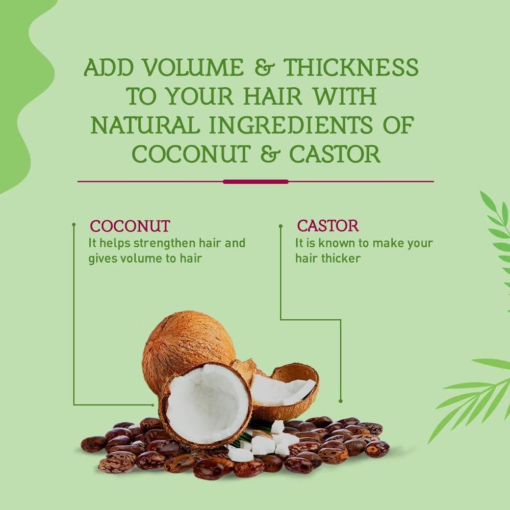- Promotes hair growth Contains castor oil, which improves blood circulation in the scalp and contributes to stimulating hair growth.